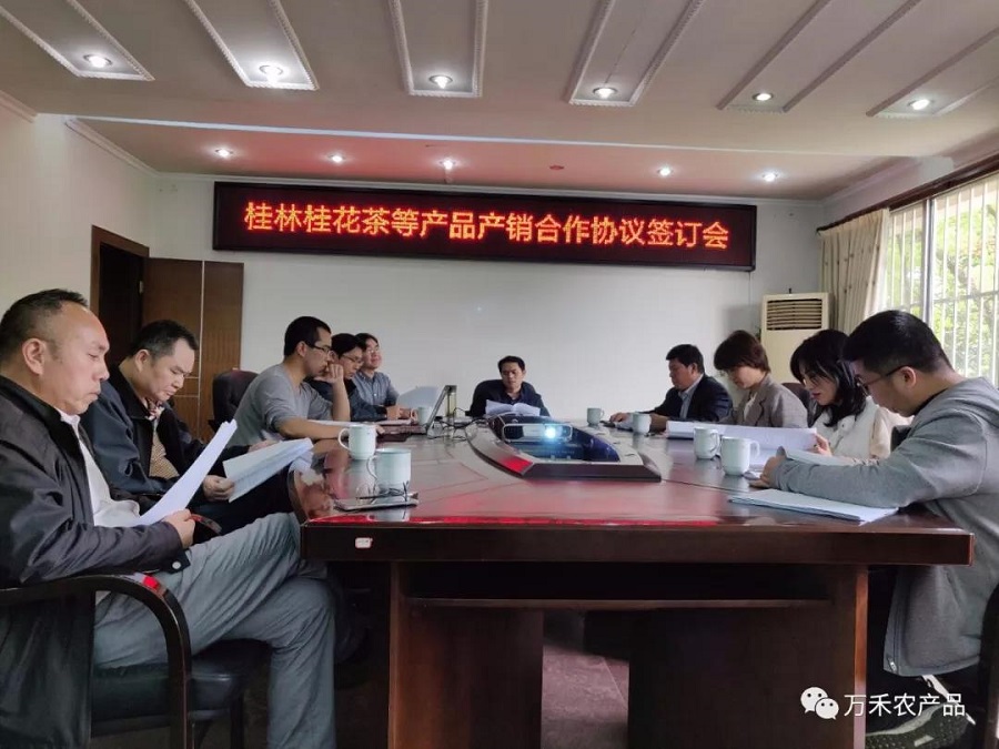 3月29日下午,萬禾農產(chǎn)品有限公司與桂林茶葉科學研究所簽訂了桂林桂花茶等產(chǎn)品產(chǎn)銷合作協(xié)議。桂林市茶葉科學研究所所長韋靜鋒、桂林萬禾農產(chǎn)品有限公司黨總支書記、總經(jīng)理崔萌佳、董事長陶辛有等人出席簽約儀式。