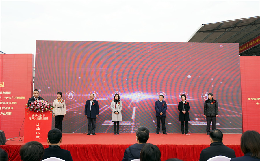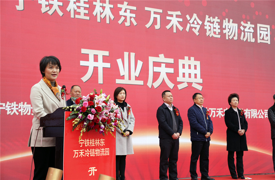▲桂林市政府副市長(zhǎng)鐘洪宣布:寧鐵桂林東萬(wàn)禾冷鏈物流園正式開(kāi)園