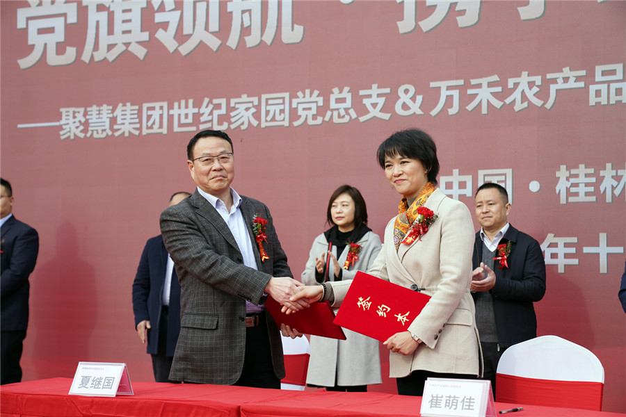 ▲黨旗領(lǐng)航·攜手助力鄉(xiāng)村 振興聚慧集團(tuán)世紀(jì)家園黨總支與桂林萬(wàn)禾農(nóng)產(chǎn)品有限公司黨總支黨建共建簽約儀式