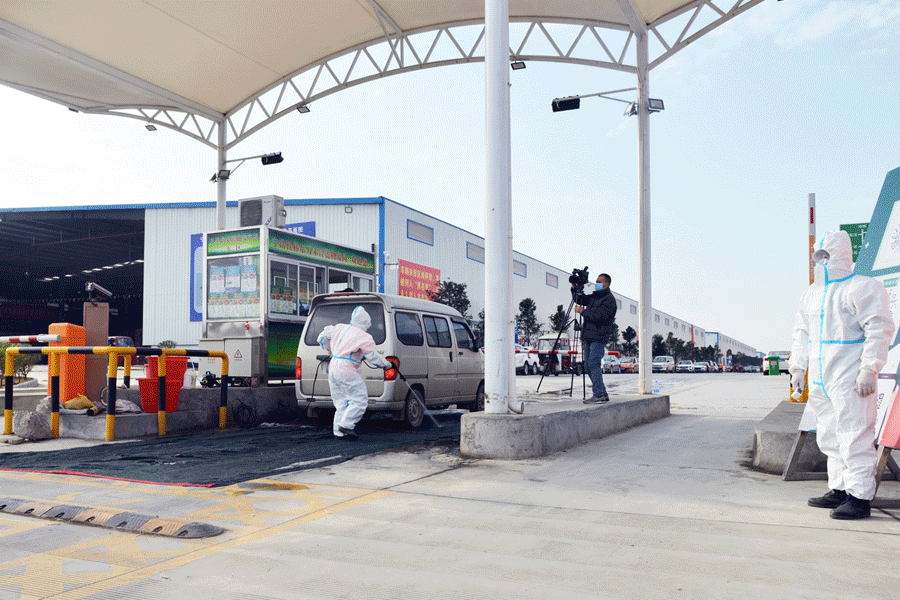 ▲對進出市場車輛和市場倉位進行病毒消殺