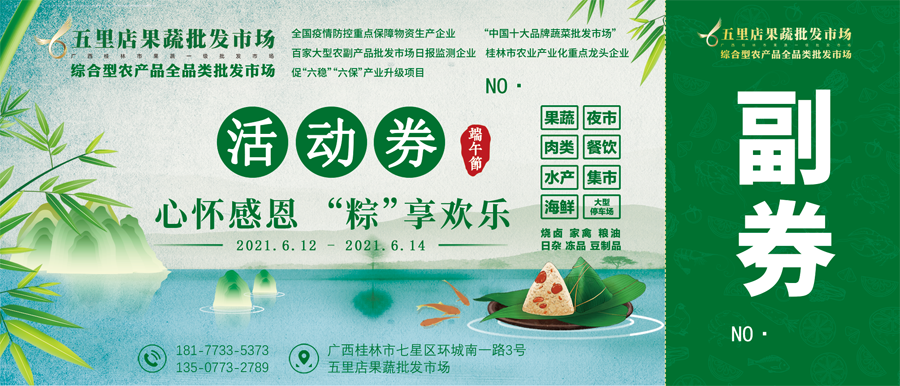 五里店果蔬批發(fā)市場——綜合型農(nóng)產(chǎn)品全品類批發(fā)市場期間試業(yè)歡迎廣大市民朋友前來市場消費(fèi),完成相應(yīng)集章數(shù)量,即可獲端午佳節(jié)五子好禮以及非常實(shí)用美觀的購物拖車。