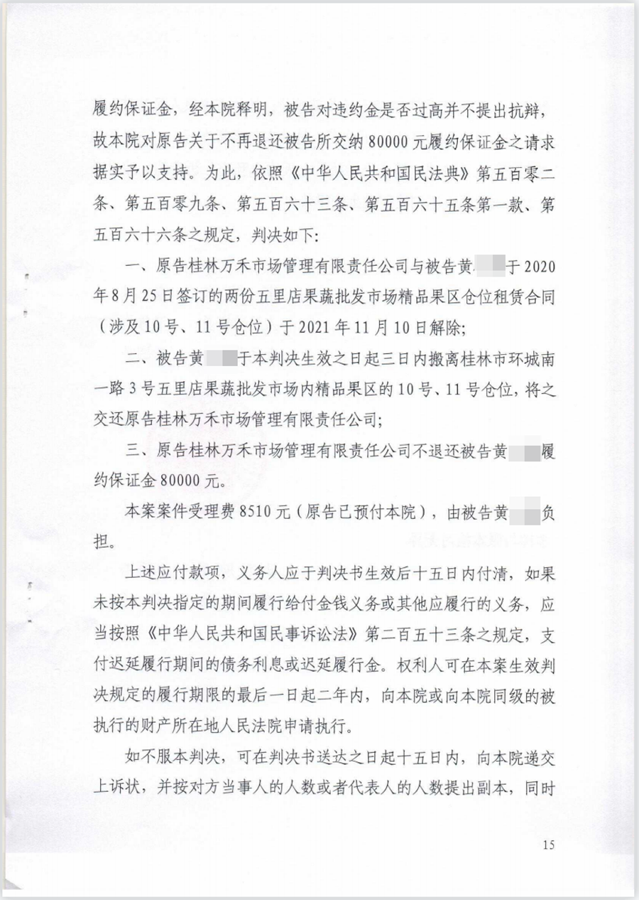 三、原告桂林萬禾市場管理有限責(zé)任公司不退還被告黃某某履約保證金80000元。