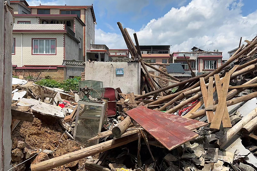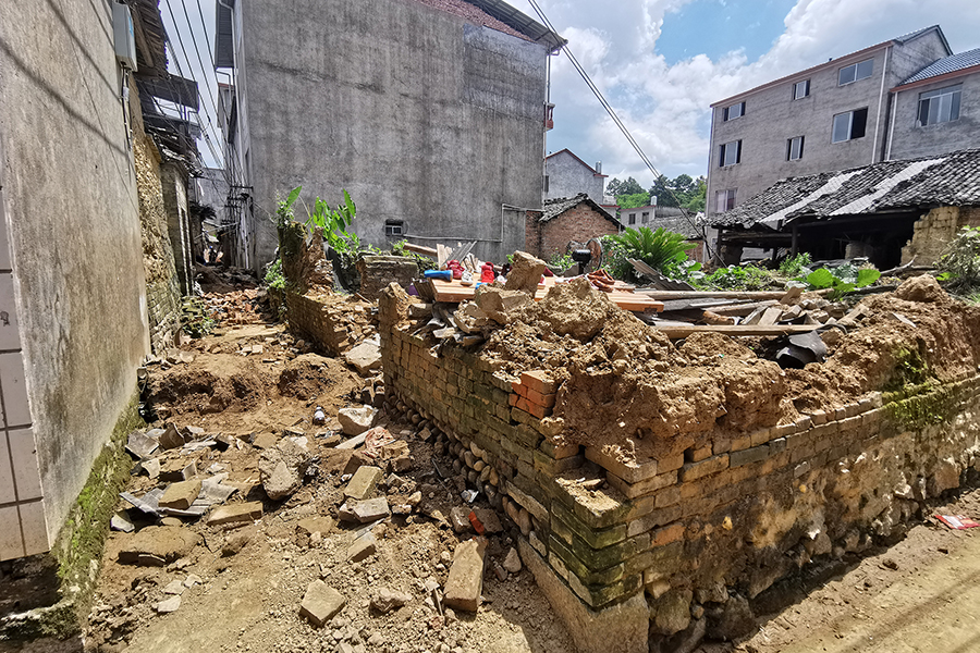 洪澇災害侵襲后的羅江村,民房倒塌、殘垣斷壁,村民們正在展開災后重建,恢復生產。有的受災群眾住到了鄰居家中,有的群眾搭建了臨時住所。