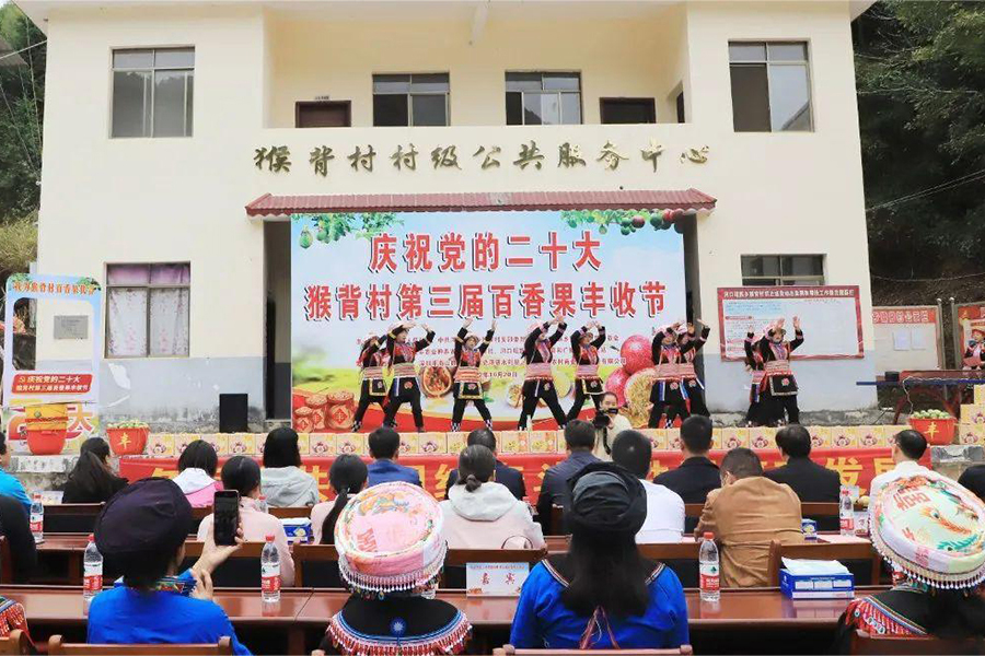 “慶祝黨的二十大 猴背村第三屆百香果豐收節(jié)”活動現(xiàn)場,文藝匯演精彩紛呈、互動游戲愉悅歡快,到場嘉賓觀眾掌聲雷動、歡呼雀躍,大家沉浸在歡樂的氛圍里,共話豐收節(jié)。舞臺上擺放著一箱箱精美的百香果禮盒,意味著300余畝百香果迎來豐收,喜悅之情溢于言表。