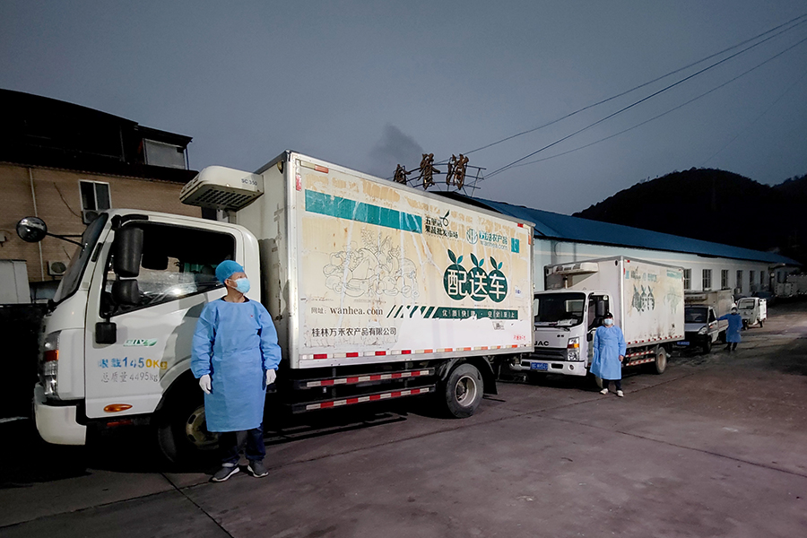 凌晨2點多,萬禾配送中心采購人員便奔赴到貨源地、批發(fā)市場,為配送生活物資“安心包”做足貨源準備。質(zhì)檢人員第一時間對貨源進行抽樣檢測,把好質(zhì)量安全關(guān)。分選人員穿戴整齊,通過分工明確的分揀程序,將每一份“安心包”分揀打包完畢。配送人員裝備好車輛,精選配送路線,保證生活物資“安心包”及時運送到達。