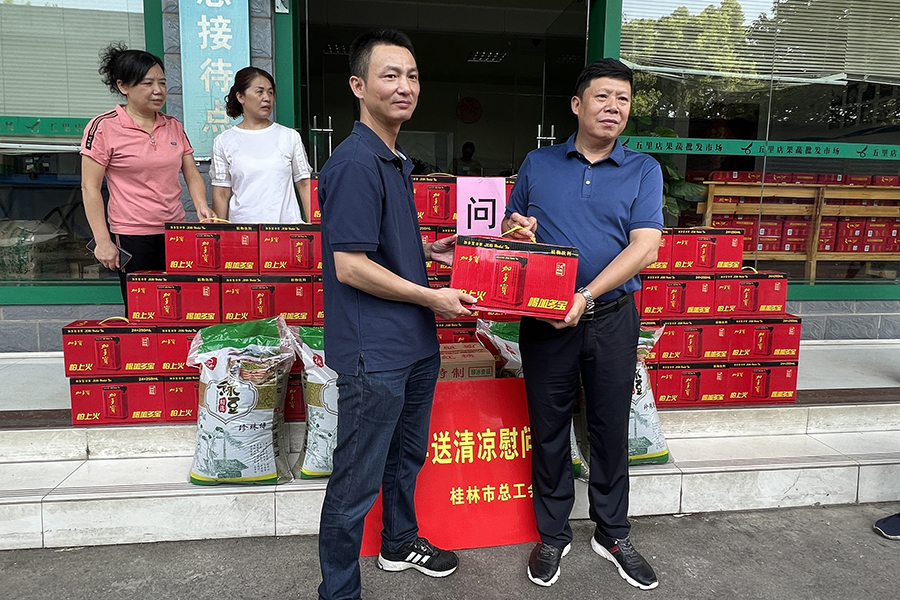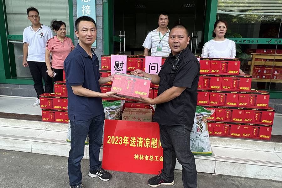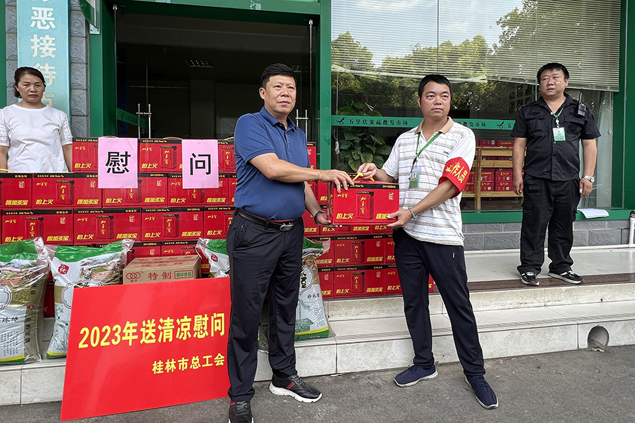 酷暑盛夏,近日桂林高溫持續(xù),為切實做好高溫天氣安全生產(chǎn)保障工作,積極關(guān)愛職工夏日健康,7月27日,桂林市總工會、七星區(qū)總工會到桂林五里店果蔬批發(fā)市場走訪慰問廣大一線職工,并現(xiàn)場發(fā)放清涼飲品、綠豆、紅糖等防暑降溫物品,為一線工作者送去組織的關(guān)心和夏日的清涼。桂林市總工會黨組成員、副主席周世偉,桂林市總工會網(wǎng)宣部部長蔣淑芳,桂林萬禾農(nóng)產(chǎn)品有限公司工會主席陶辛有參加慰問活動。