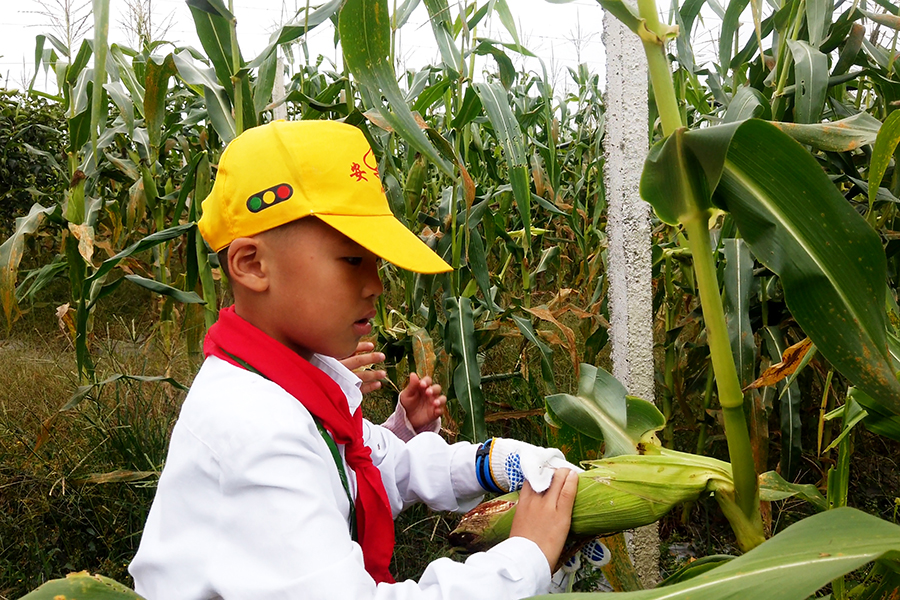 在玉米種植區(qū)前,技術人員就地取材,摘下一根成熟的玉米,并向同學們現(xiàn)場提問:“請問哪位同學知道玉米是通過什么辨別它是否成熟的?”“玉米須顏色程深褐色就表示成熟了”,有同學舉手回答道。對積極回答提問參與互動的同學,技術人員以獎勵玉米的形式進一步激發(fā)同學們學習農作物知識的興趣。