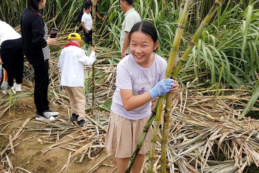 參觀農作物種植講解后,同學們分組輪流來到甘蔗地、玉米地和紅薯地,現(xiàn)場參加砍甘蔗、挖紅薯、摘玉米等勞動體驗?!鞍职郑憧?,這是我挖的紅薯?!薄皨寢專铱沉撕瞄L一根的甘蔗?!薄皨寢?,你快來看,這個玉米須是深褐色的,已經熟了,可以采摘了?!蓖瑢W們你一言,我一語,田地間洋溢著歡聲笑語。