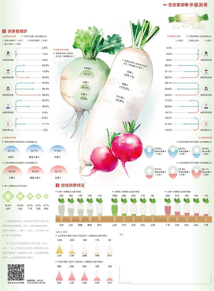從線上銷售趨勢(shì)來看,水果蘿卜、白蘿卜、紅蘿卜、青蘿卜和紅心蘿卜等產(chǎn)品的熱度最高。今冬蔬菜價(jià)格偏低,雖然蘿卜是“大路菜”,但有了地理標(biāo)志“金名片”加持,也能獲得不錯(cuò)的銷售反響。數(shù)據(jù)顯示,地標(biāo)農(nóng)產(chǎn)品天津沙窩蘿卜、山東濰縣水果蘿卜等廣受消費(fèi)者歡迎。